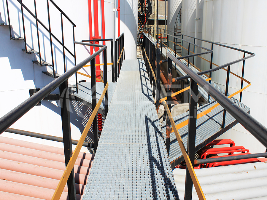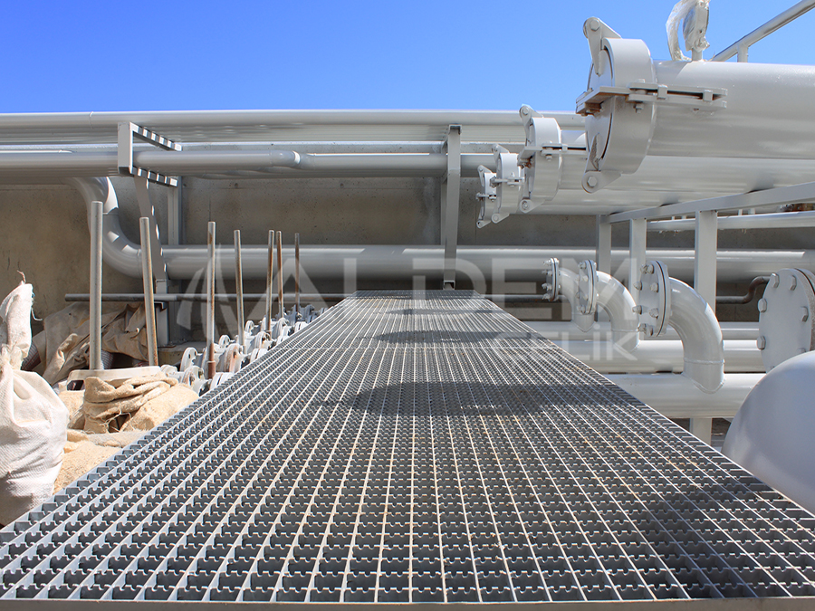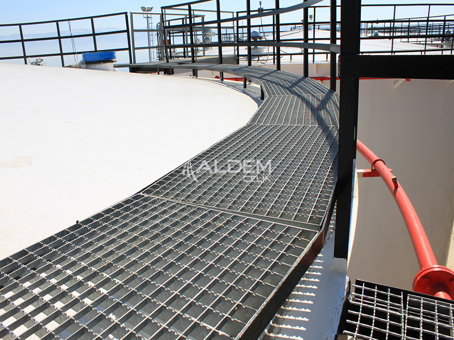 Platform ızgaraları, civata bağlantılı kelepçe sistemleriyle ana konstrüksiyona sabitlenir.